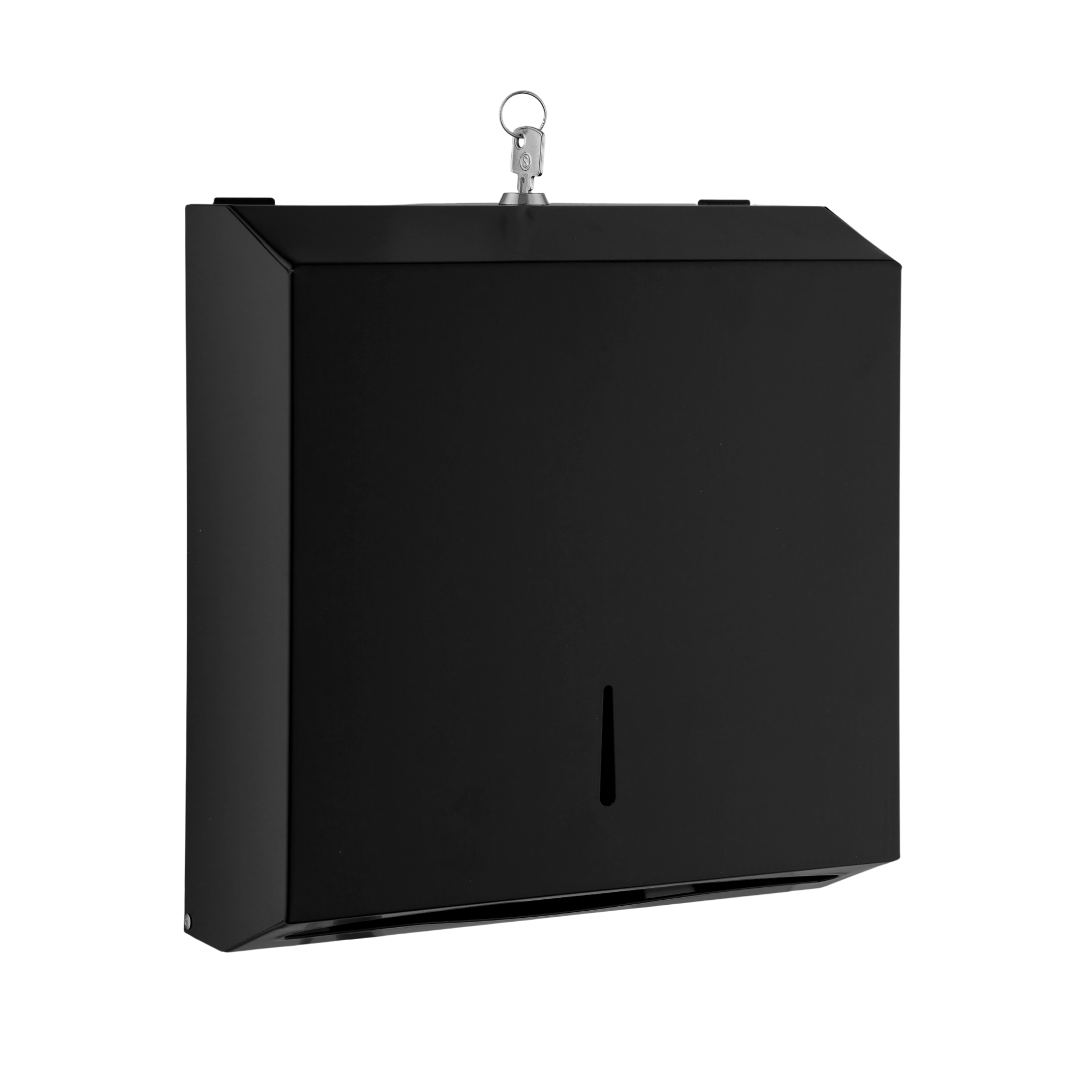 Диспенсер для бумажных полотенец в листах Z сложения, корпус из нержавеющей стали, с ключом, черного матового цвета.
