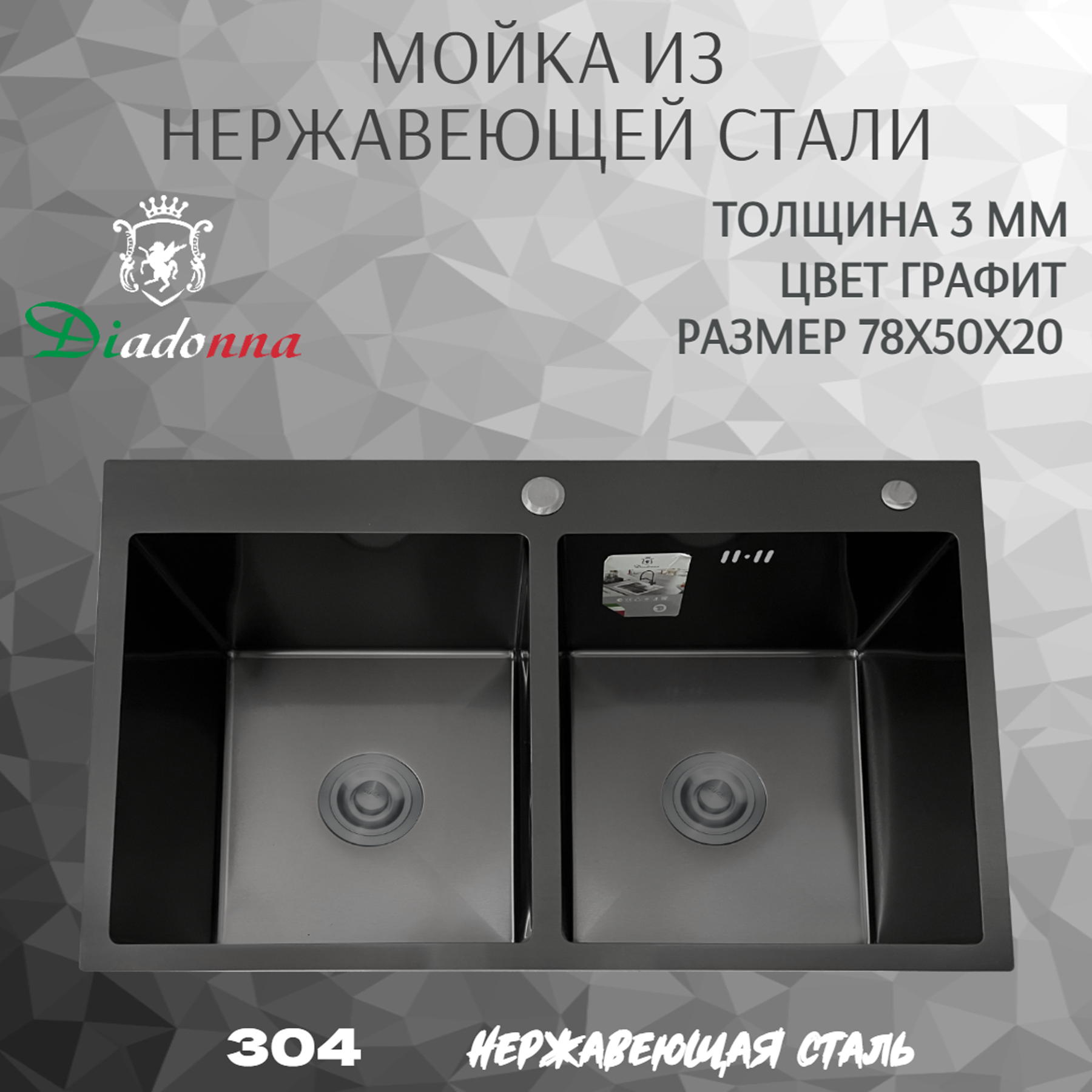 Мойка для кухни из нержавеющей стали двойная SUS304 3 мм, 78*50*20 cм, ЧЕРНЫЙ, DS7850BT