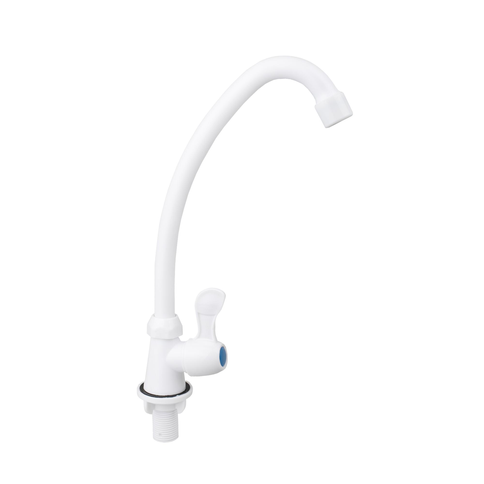 Кран для раковины из АБС пластика БЕЛОГО цвета - это компактное недорогое решение для санузлов, приусадебных участков, общественных и прочих мест, где нет возможности постоянного ухода за смесителем. Смеситель для раковины оснащен жестким литым изливом, который долго не приходит в негодность.