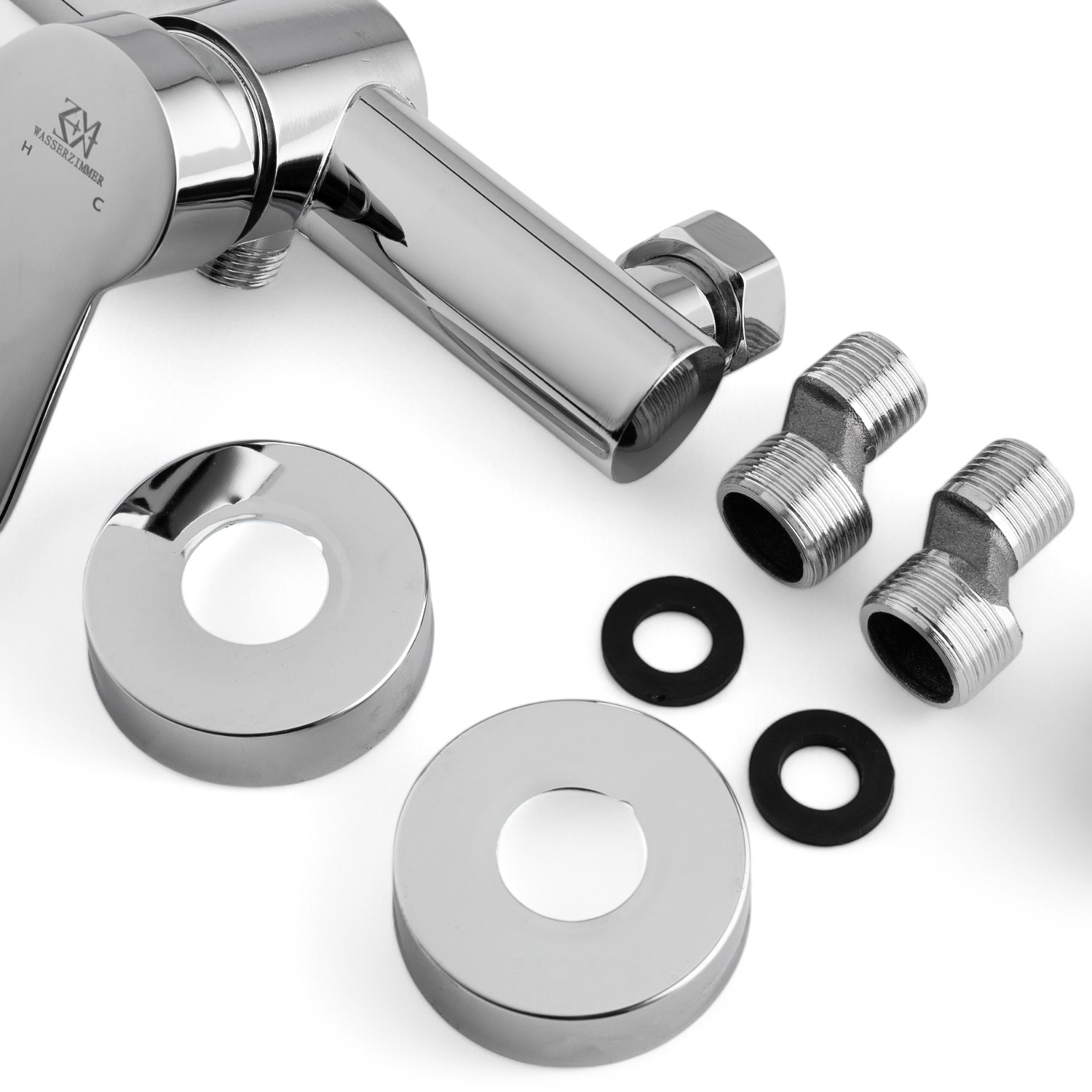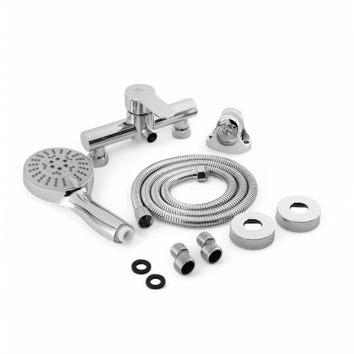 корпус смесителя; эксцентрики, декоративные чашки, держатель для лейки; шланг; лейка
