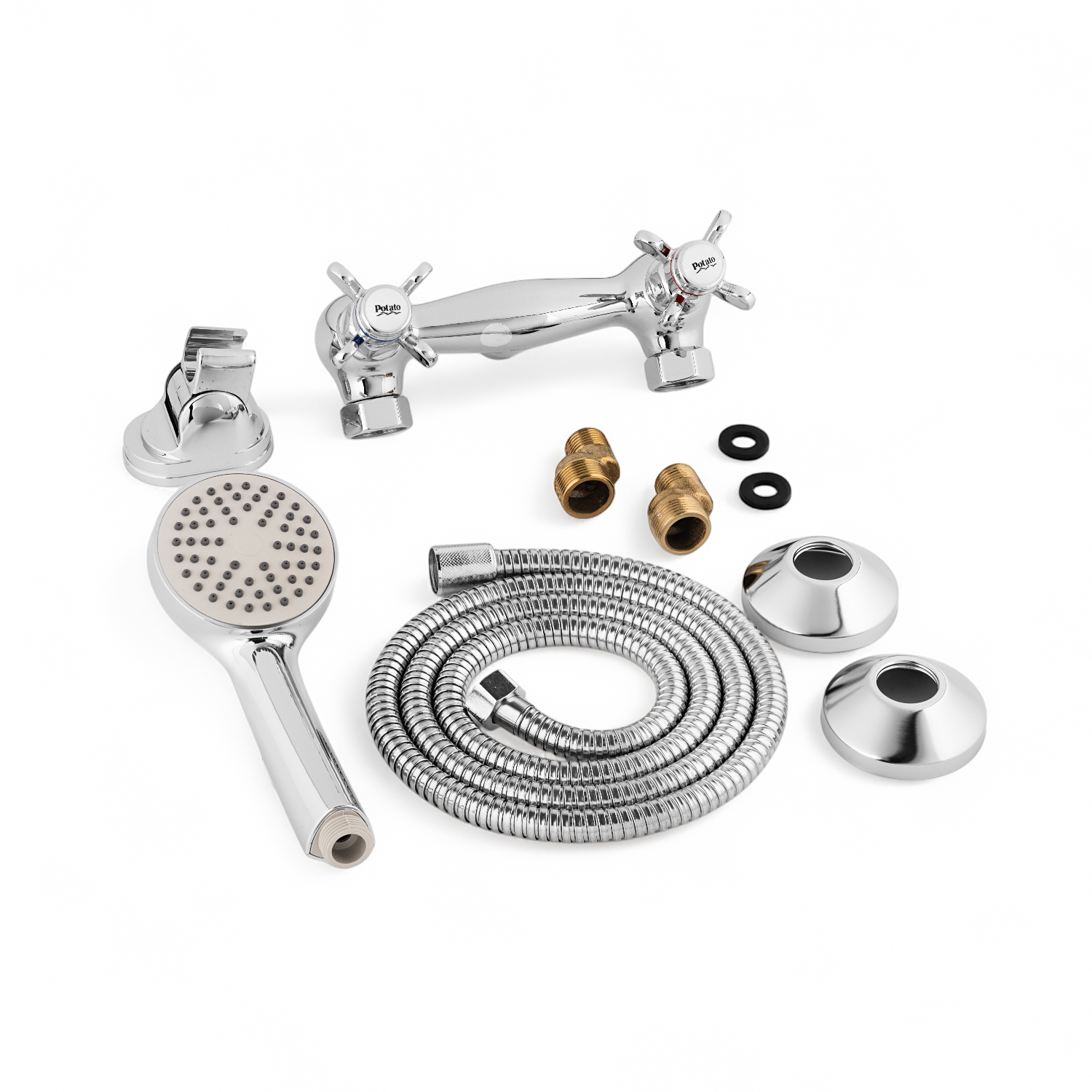 корпус смесителя, эксцентрики, чашки, набор креплений, лейка, шланг, держатель для лейки