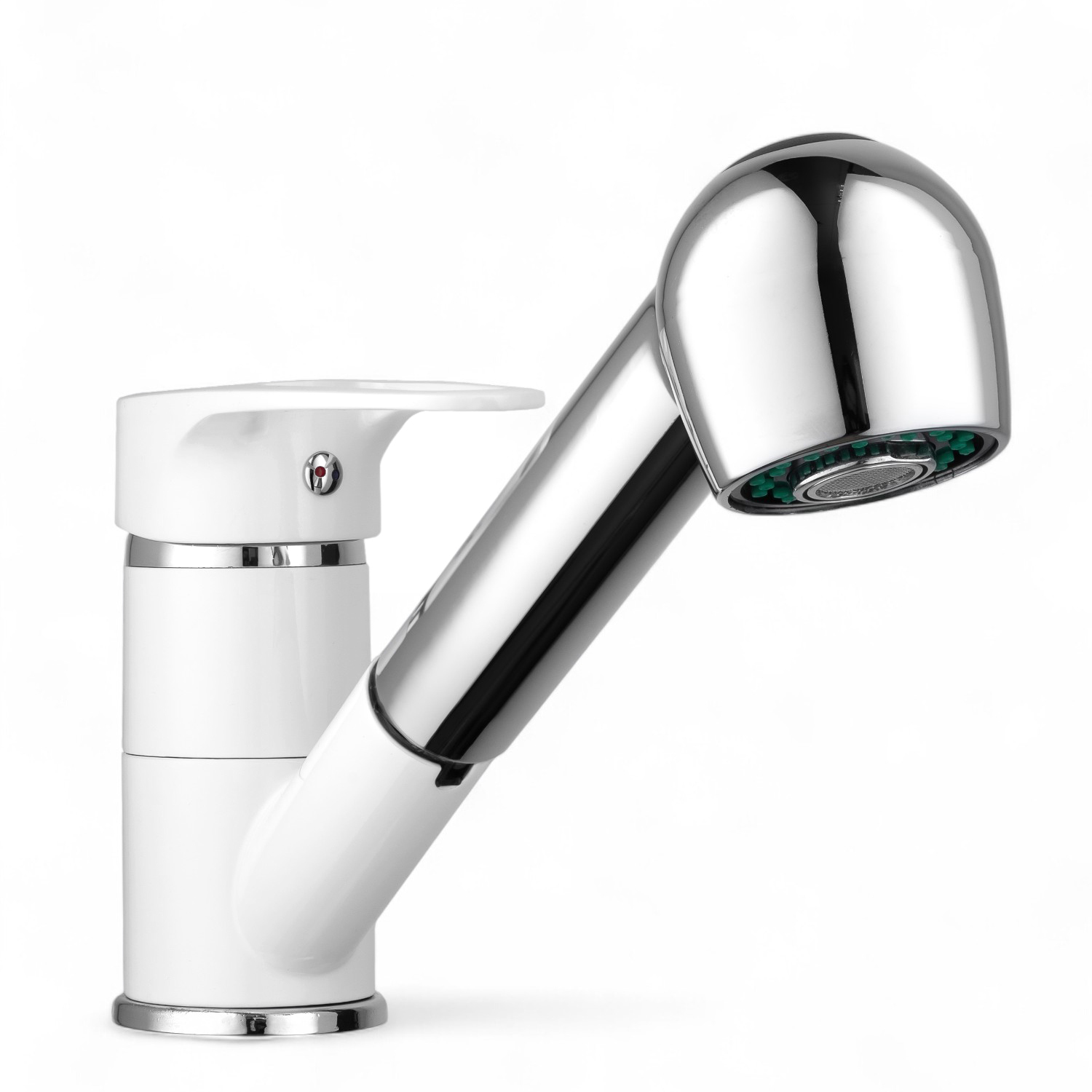 Смеситель для кухни белый глянцевый с гибким вытяжным изливом и двухрежимным аэратором хромированный имеет ряд преимуществ: