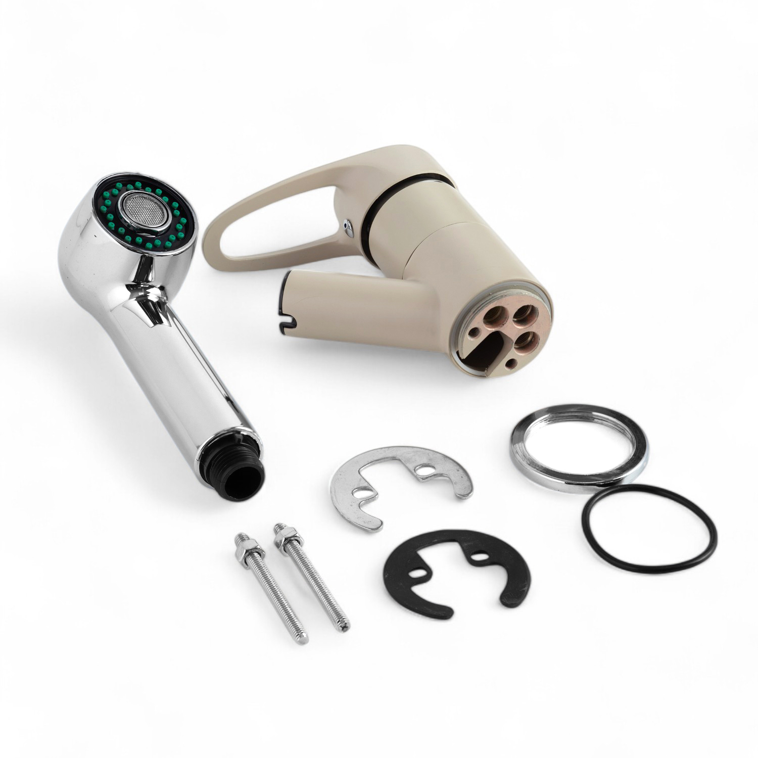 Смеситель для кухни бежевый с гибким вытяжным изливом и двухрежимным аэратором хромированный имеет ряд преимуществ: