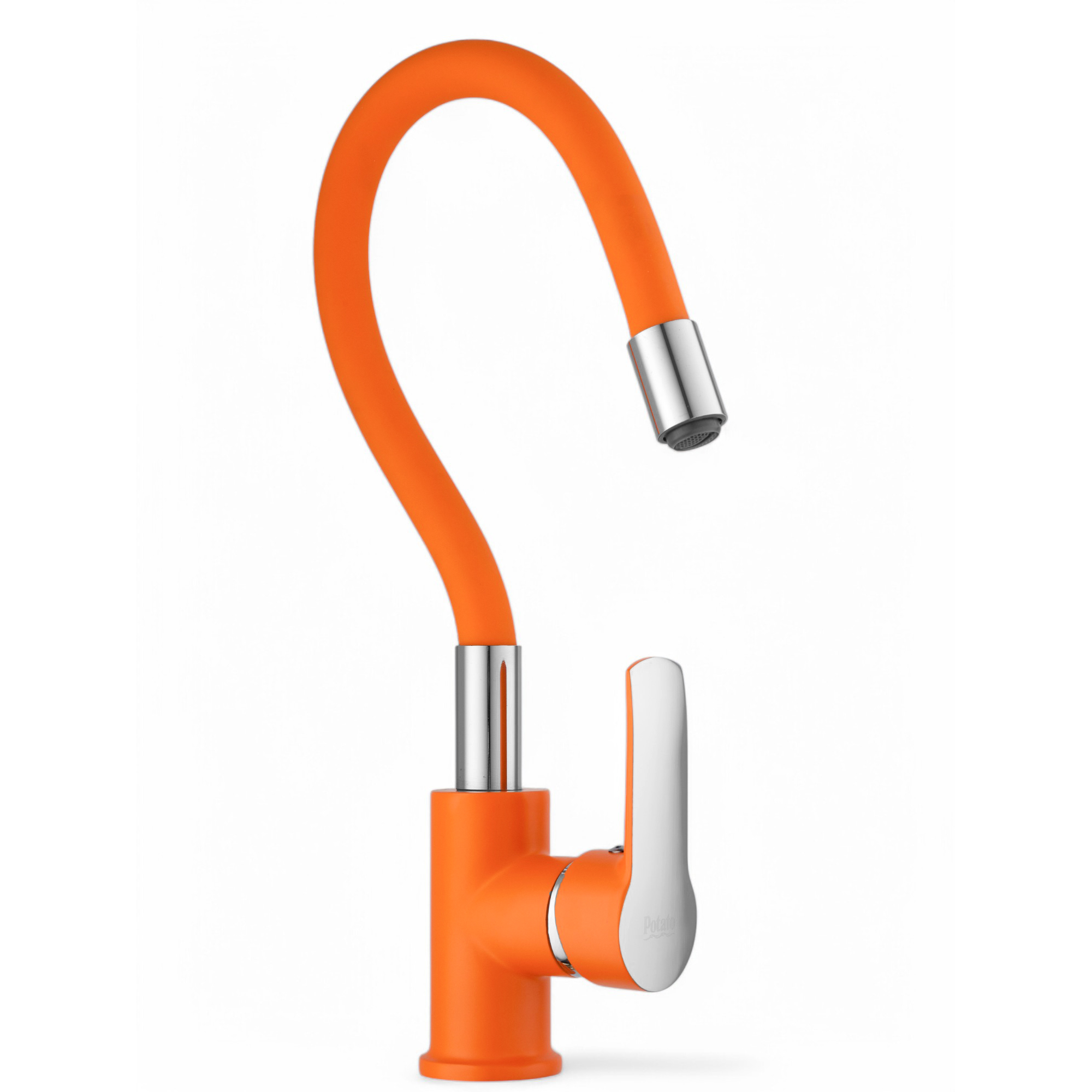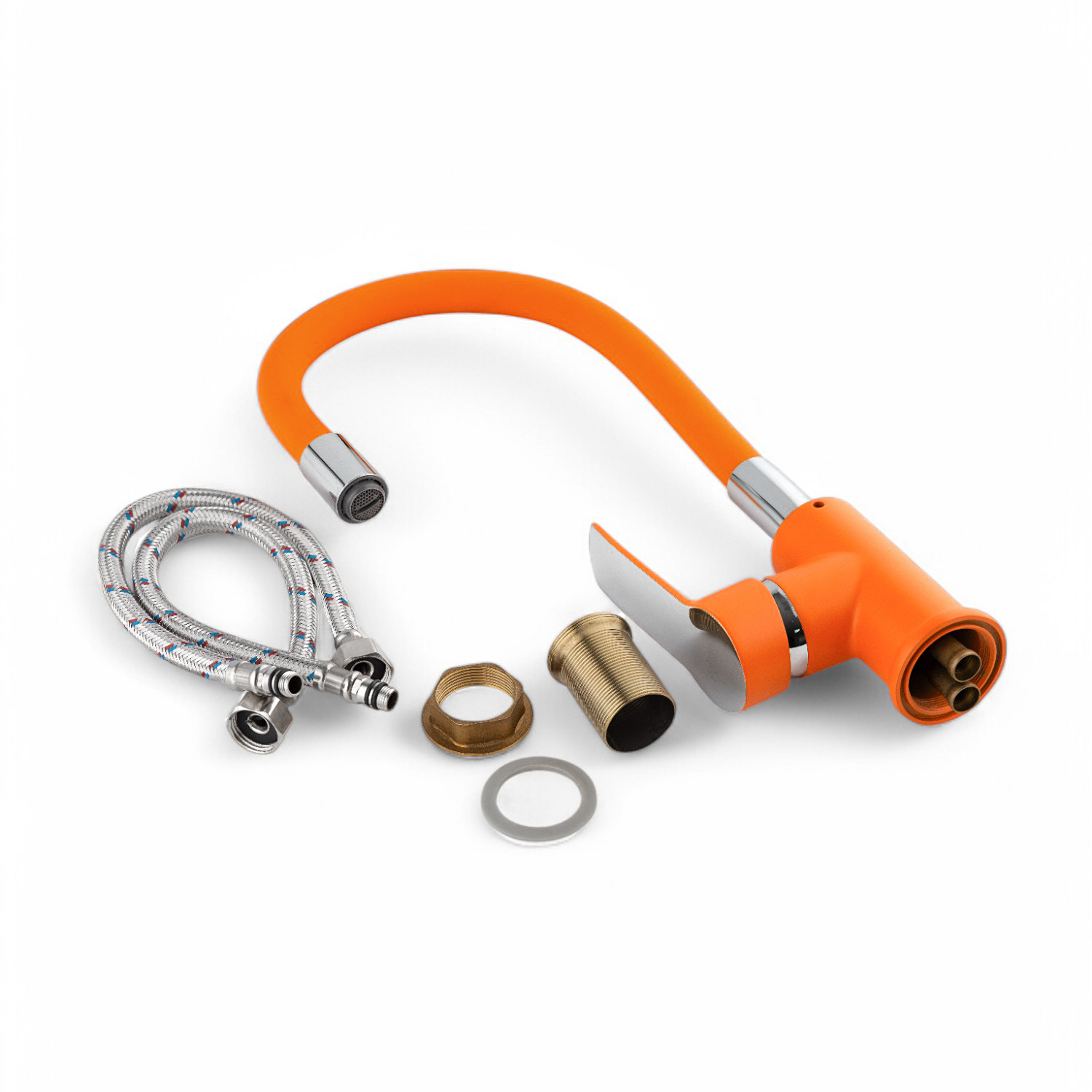 Смеситель для кухни с гибким изливом оранжевого цвета, хромированным аэратором и хромированной однорычажной ручкой — это стильное и функциональное решение для кухни и общественных мест. Аэрированный поток насыщает воду воздухом, что делает её более мягкой и приятной для использования.