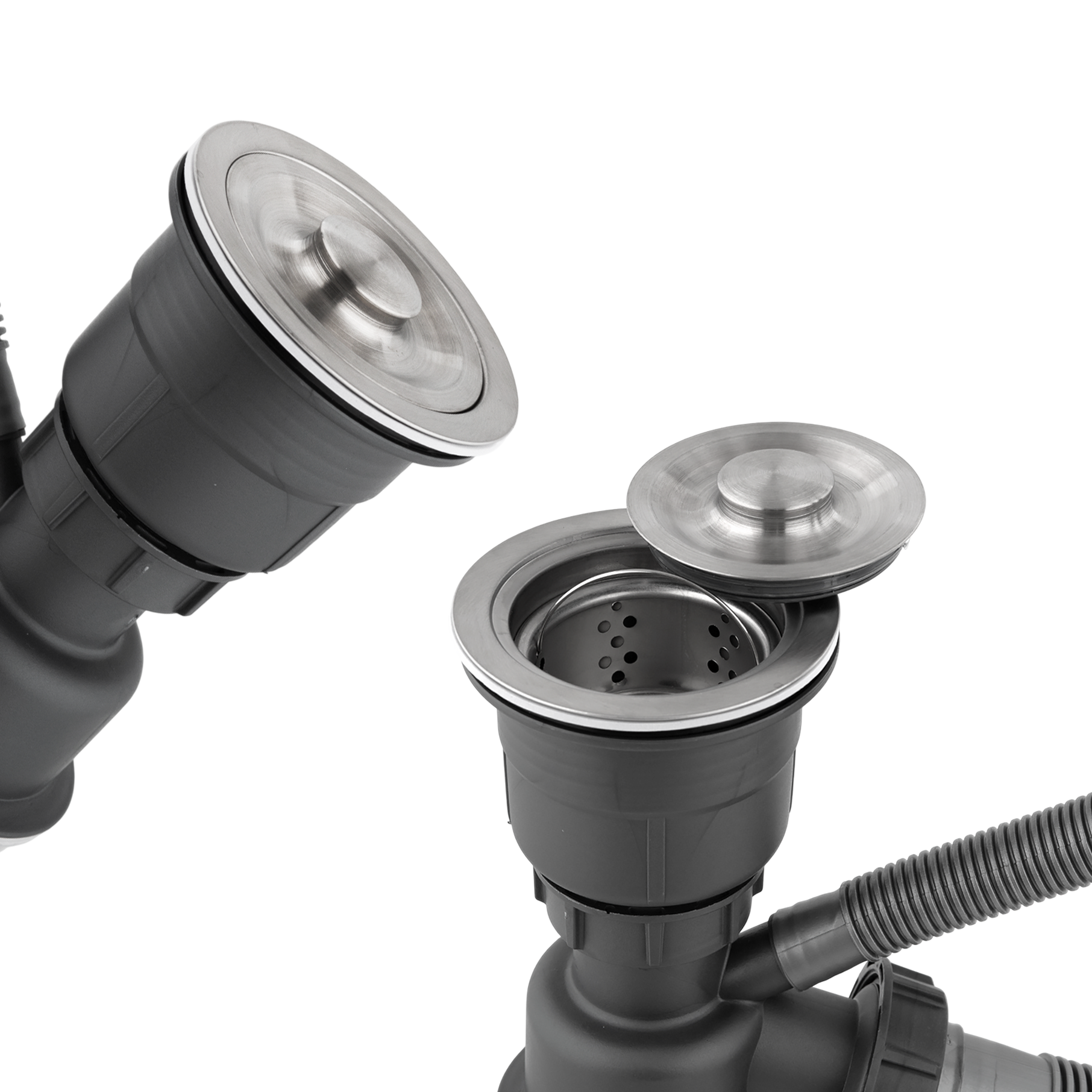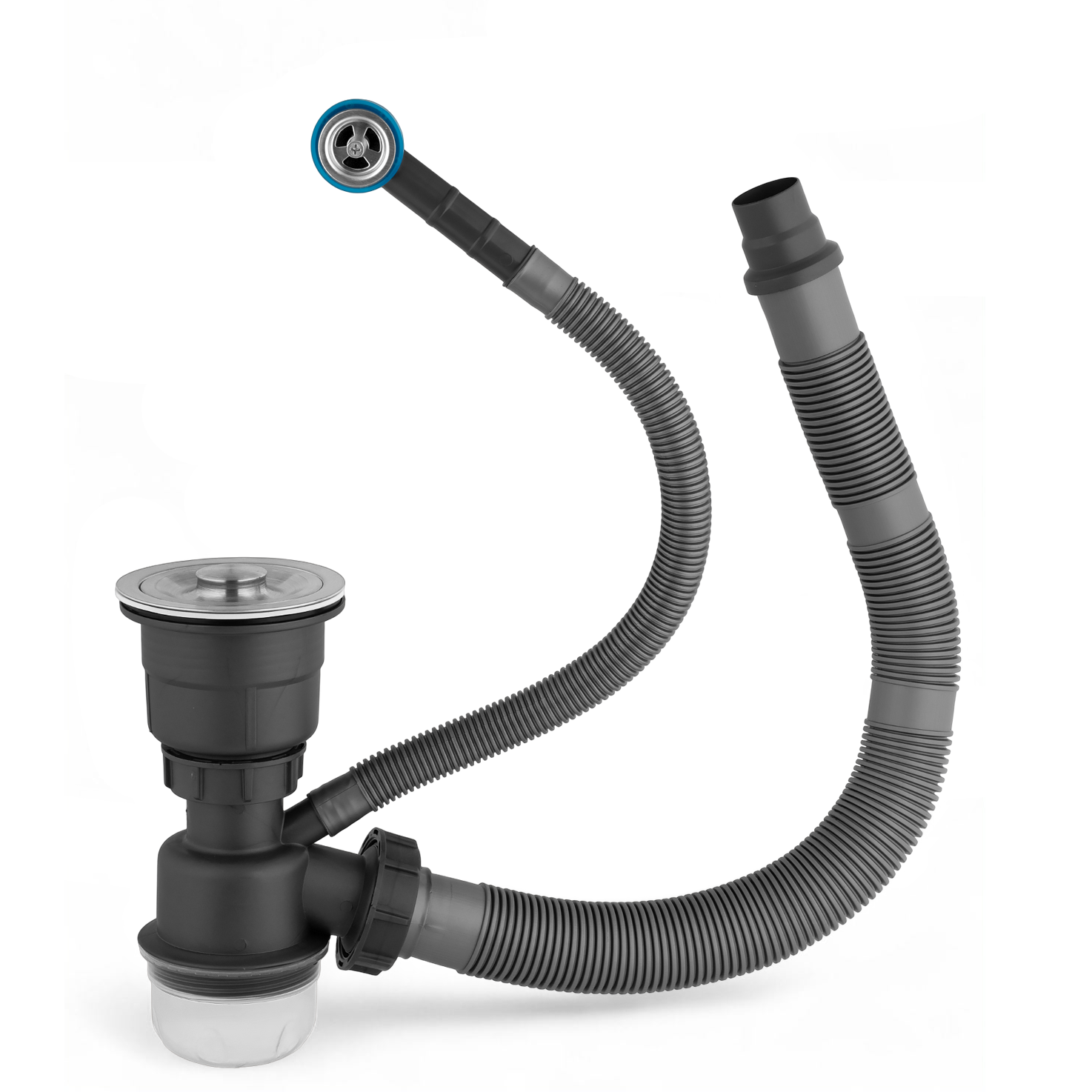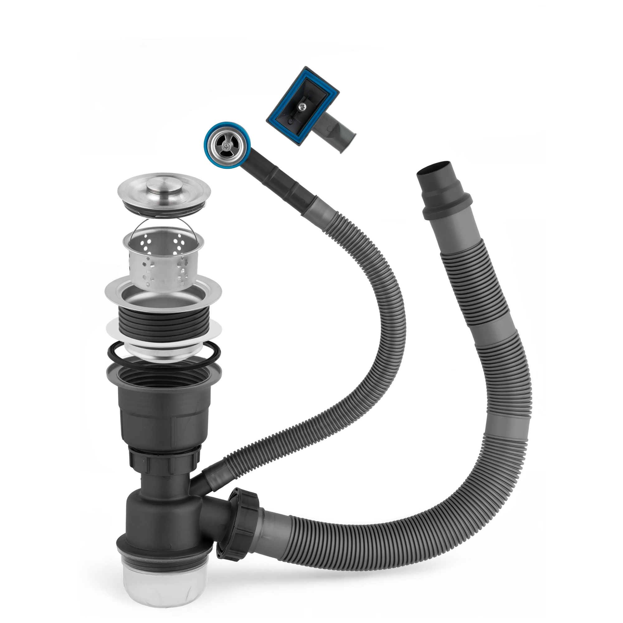 Сифон для раковины на кухню с переливом для всех типов моек. Сифон для каменной мойки с переливом верхняя часть сатин - это идеальный выбор для тех, кто ценит комфорт и удобство во время использования кухонной мойки. Сифон сконструирован под диаметр сливного отверстия 90 мм, имееет глубокую горловину и бутылочный тип, что обеспечивает хорошую пропускную способность и формирование гидрозатвора. Горловина оснащена съемной корзиной для мусора, которые позволяют легко удалять отходы из раковины. Конструкция сифона проста в установке, позволяет легко снимать отстойник и чистить его в случае засорения. Сифон выполнен из высококачественного пластика ABS с гидрозатвором, предотвращающим проникновение запахов из канализации. Крышка для сифона в комплекте. Благодаря всем этим преимуществам, наш сифон станет незаменимым помощником на вашей кухне. Он поможет поддерживать чистоту и порядок, а также обеспечит комфорт и удобство при использовании кухонной мойки. Диаметр верхней чаши 110 мм, высота чаши слива 100 мм, длина резьбы чаши 38 мм, высота бутылочной части 156 мм, нижняя гофра 650 мм, гофра перелива 390 мм, перелив для нержавеющей мойки 62,5х40 мм., перелив для каменной мойки Ø 40 мм, длина 115 мм. Соединительные резьбы 56 мм. Сливной диаметр 35-50 мм