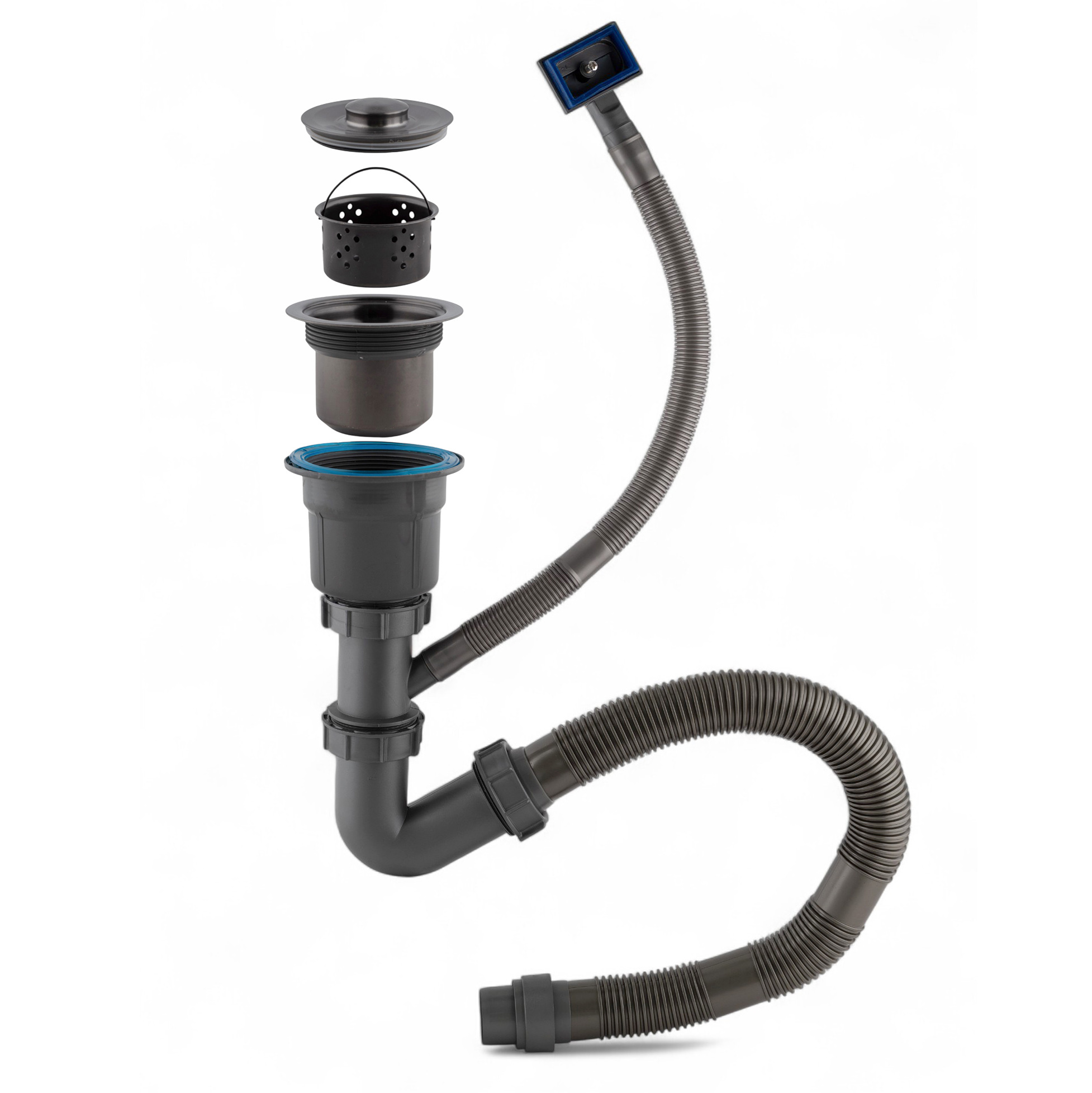 Сифон для мойки с переливом верхняя часть ГРАФИТ - это идеальный выбор для тех, кто ценит комфорт и удобство во время использования кухонной мойки. Сифон имеет диаметр сливного отверстия 90 мм, глубокую горловину и коленный тип, что обеспечивает хорошую пропускную способность и формирование гидрозатвора. Горловина оснащена съемными корзинами для мусора, которые позволяют легко удалять отходы из раковины. Конструкция сифона проста в установке, позволяет легко снимать отстойник и чистить его в случае засорения. Сифон выполнен из высококачественного пластика ABS с гидрозатвором, предотвращающим проникновение запахов из канализации,.Благодаря всем этим преимуществам, наш сифон станет незаменимым помощником на вашей кухне. Он поможет поддерживать чистоту и порядок, а также обеспечит комфорт и удобство при использовании кухонной мойки. Диаметр верхней чаши 110 мм, высота чаши слива 100 мм, высота колена 140 мм, нижняя гофра 650 мм, гофра перелива 390 мм, перелив 62,5х40 мм. Сливной диаметр 40мм