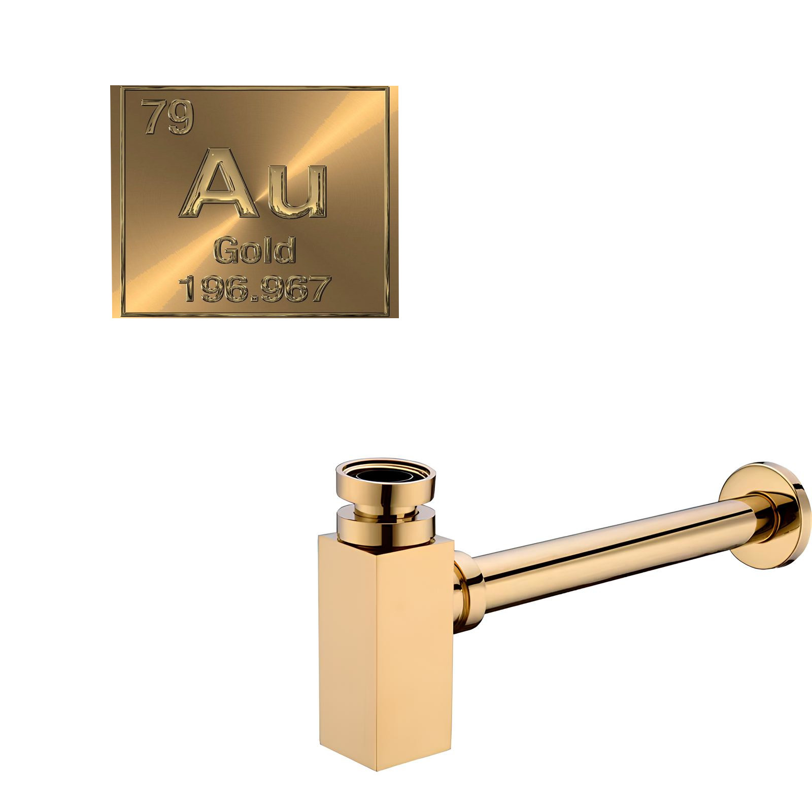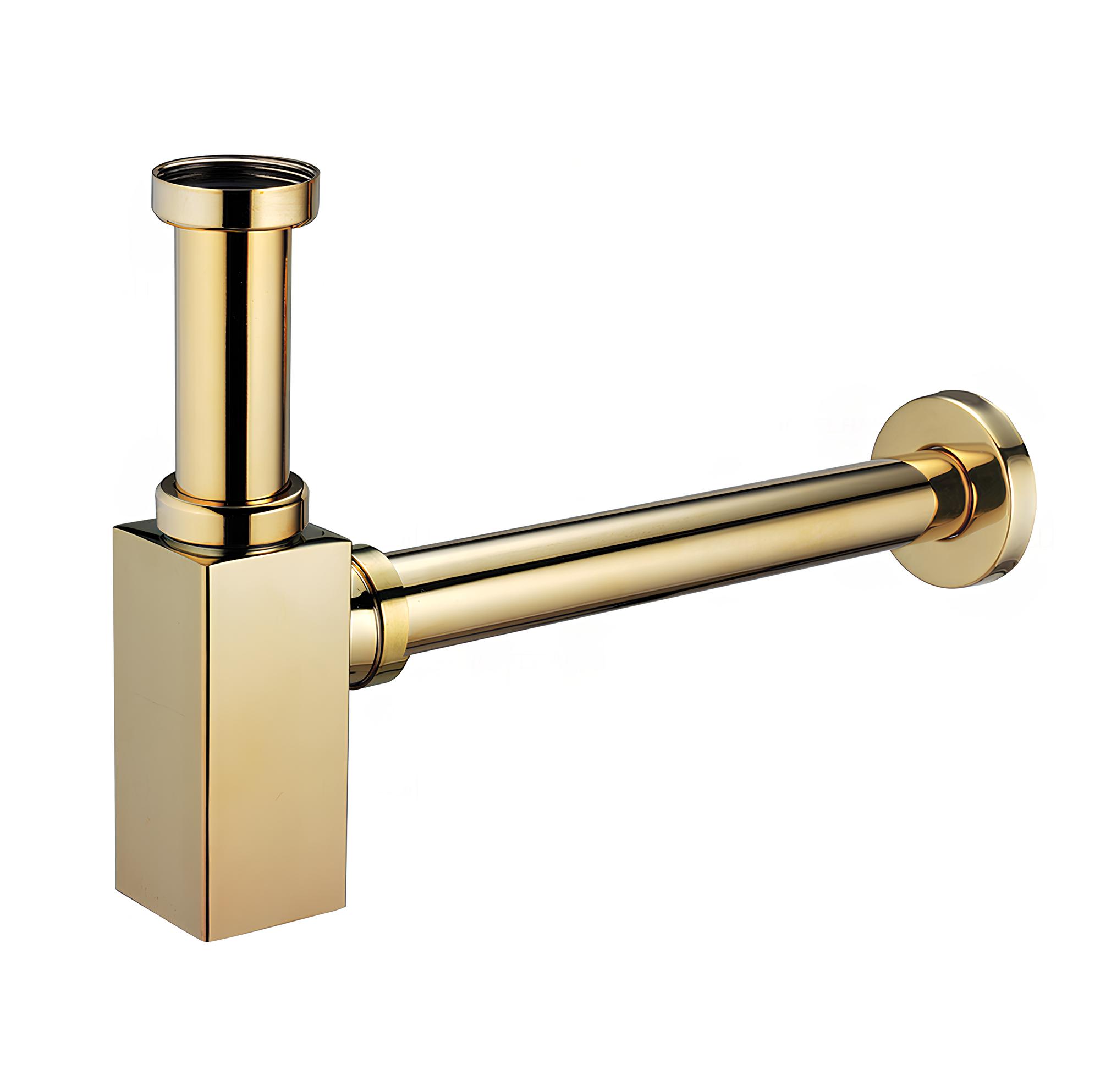 Сифон для раковины золотой с квадратной бутылочной частью, это эстетичное и функциональное устройство для подключения раковины к системе канализации. Бутылочная модель изготовлена из латуни, что обуславливает ее высокую прочность и долговечность. Она устойчива к перепаду температур, поэтому в раковину можно сливать кипяток. Поверхность с PVD покрытием сохраняет зеркальный блеск даже после длительной эксплуатации, поверхность не требует особого ухода – достаточно просто протереть. Изделие с фиксированной погружной трубкой легко собирается и монтируется. В нижней части сифона находится ревизионная гайка. Открутив которую можно с легкостью удались накопившийся мусор.