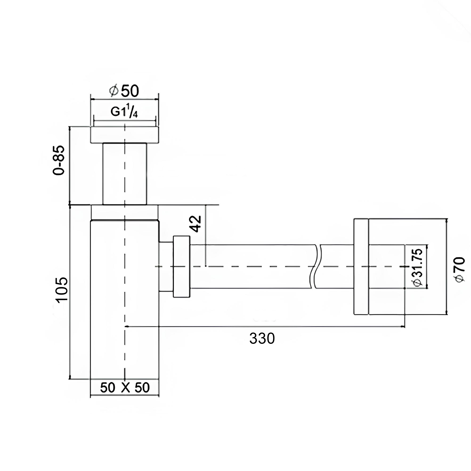 Габаритные размеры: высота колбы 105 мм, верхняя трубка регулируется от 0 до 85 мм, грани колбы 50 мм, длина отводной трубки 300 мм, диаметр отводной трубки 32 мм, диаметр декоративного кольца 70 мм.